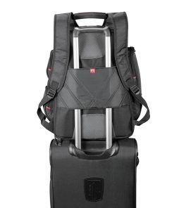 Key product details include a side entry laptop compartment that can hold up to 17” laptops. The main zippered compartment is equipped with a file divider and interior side pockets, as well as a removable TechTrap elastic organiser panel. Additionally, there is a zippered media pocket with access to the earbud port. The front zippered pocket offers a deluxe organiser and key fob, while there are also front lower and hidden pockets for valuables. The backpack also has three spacious side zippered pockets. For comfort, it features a yoke-style handle and padded back and shoulder straps. The back panel is designed to easily slide over trolley handles.